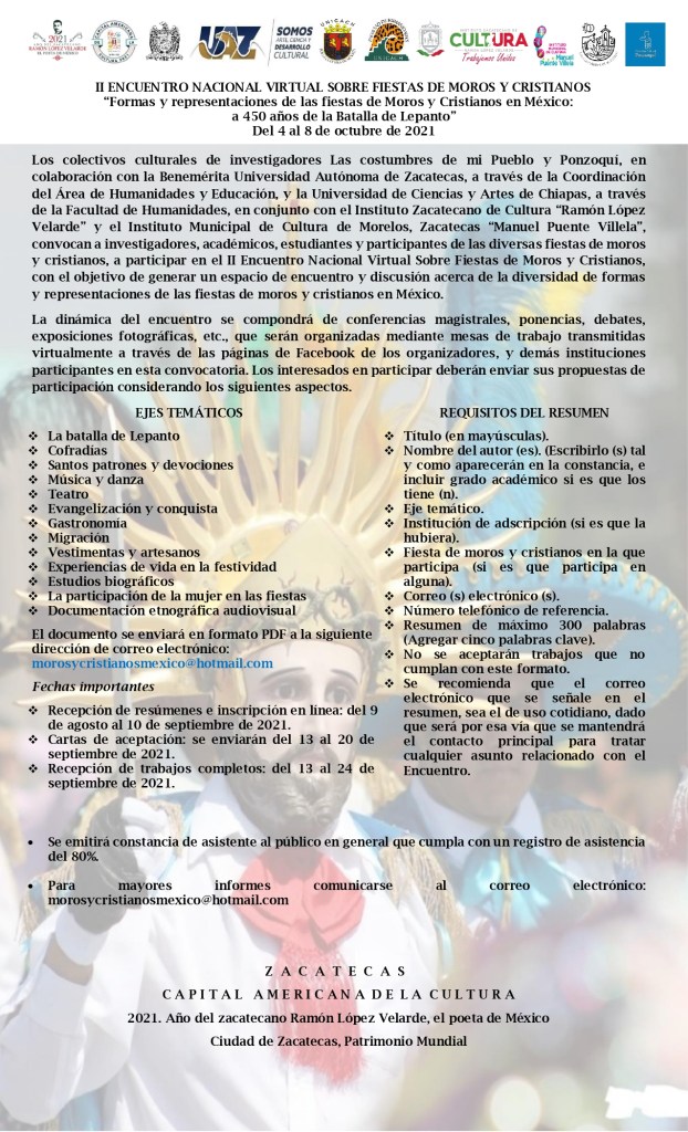Las danzas de Moros y Cristianos que tendrán presencia en este evento, encontramos la Danza de los Tastuanes, de Tonalá, Jalisco, y la Danza de los Santiagos, que se realiza en la comunidad sede de Coscomatepec y en las comunidades vecinas de Ixhuatlán del Café, Chocamán, Calcahualco y Alpatláhuac.