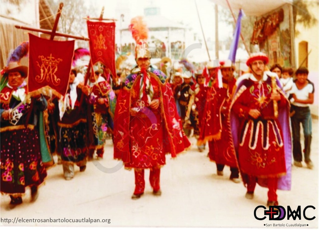 Los danzantes que aparecen al frente son, de izquierda a derecha, el Rey Cristiano, el Sabario y el Rey Moro. Esta configuración es la imagen clásica de las Santiaguerías en San Bartolo Cuautlalpan, con la columna de los Cristianos a la derecha, la de los Moros a la izquierda (desde la perspectiva de la Santiaguería) y al centro, el Sabario.