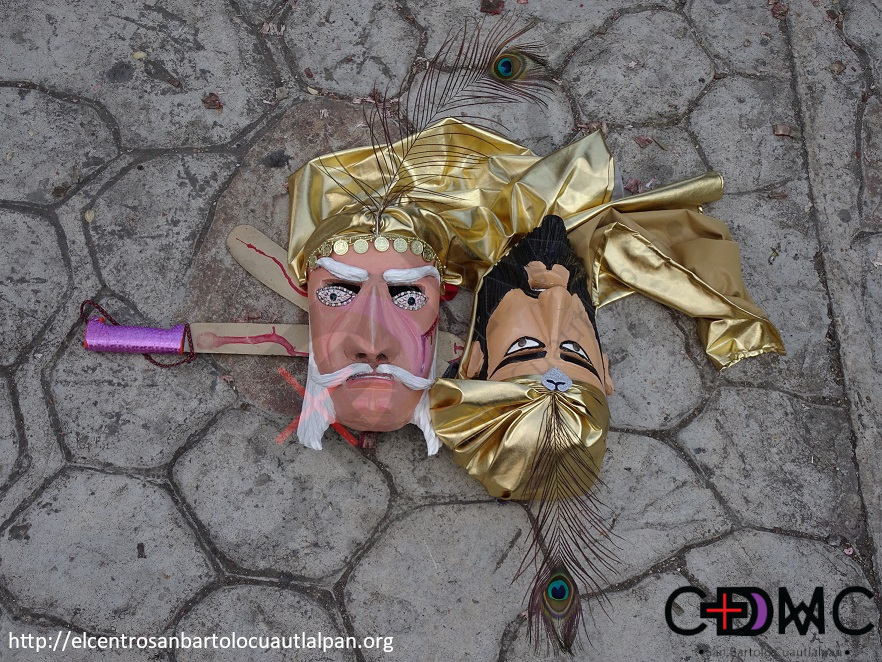 Durante la representación los danzantes realizan una pausa para descansar y colocan sus máscaras y aditamentos en el suelo, en el lugar donde dejaron de bailar o muy cerca de él, ya que después del descanso retoman la danza para la parte final de la representación. La fotografía fue tomada durante este descanso el 14 de diciembre de 2019.